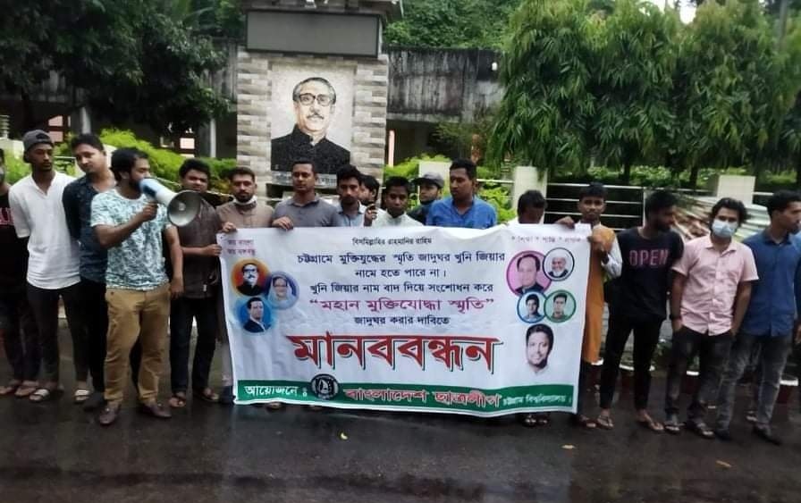 চট্টগ্রামে মুক্তিযুদ্ধের স্মৃতি জাদুঘরে জিয়াউর রহমানের নাম বাদ দিয়ে সংশোধন করে ‘মহান মুক্তিযুদ্ধ স্মৃতি জাদুঘর’ করার দাবিতে মানববন্ধন করেছে চট্টগ্রাম বিশ্ববিদ্যালয় শাখা ছাত্রলীগ।