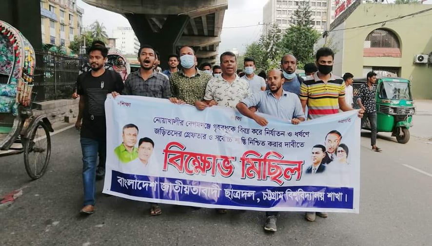 নোয়াখালীর বেগমগঞ্জে গৃহবধূকে বিবস্ত্র করে নির্যাতন এবং ধর্ষণকারীদের অবিলম্বে গ্রেপ্তার ও সর্বোচ্চ শাস্তির দাবীতে বিক্ষোভ মিছিল করেছে চট্টগ্রাম বিশ্ববিদ্যালয়(চবি) ছাত্রদল।